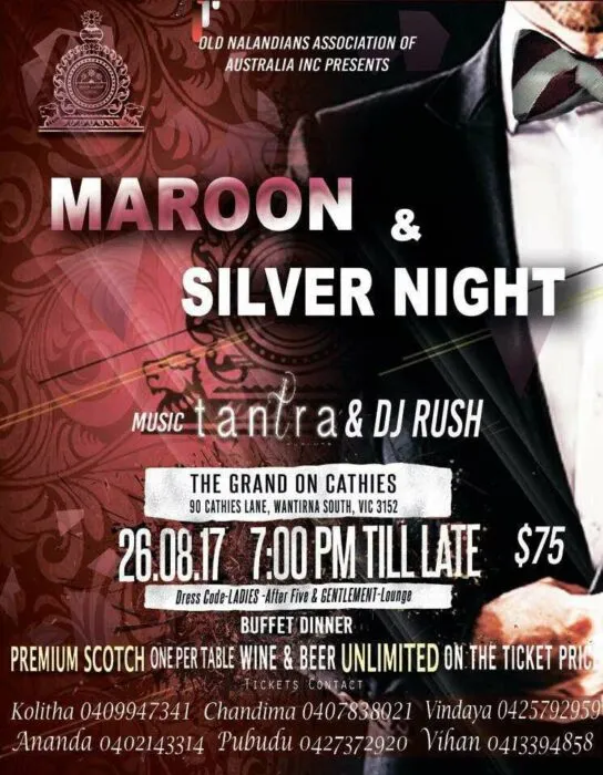Maroon & Silver Night presented by the Old Nalandians Association of Australia Inc featuring Tantra & DJ Rush. Tickets: $75 For more information Kolitha: 0409947341, Chandima: 0407838021, Vindaya: 0425792959