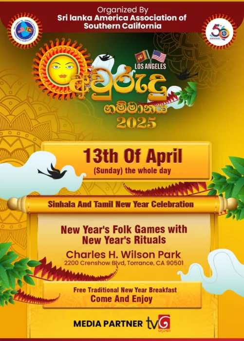 Join the Sri Lanka America Association of Southern California for Sinhala and Tamil New Year Festival at Charles H. Wilson Park (2200 Crenshaw Blvd, Torrance, CA 90501) on Sunday, April 13, 2025, from 8:00 AM to 6:00 PM.