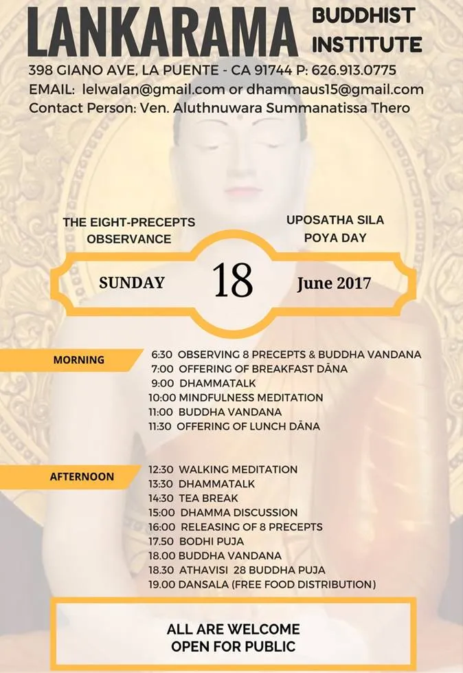Lankarama Buddhist InstituteObservance of eight precepts Fee: FREE, ALL ARE WELCOME Contact: Lankarama Buddhist Institute (626) 913 [...]