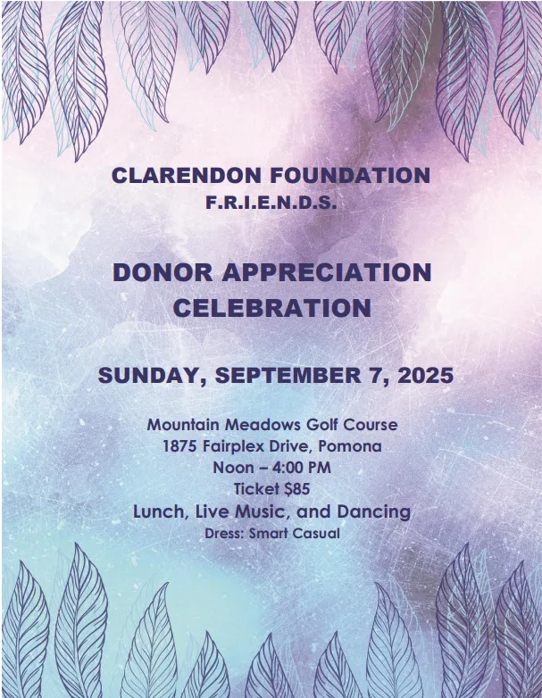 September 7, 2025 @ 12:00 pm - 4:00 pm PDT Clarendon Foundation’s F.R.I.E.N.D.S. Celebration Mountain Meadows Golf Course 1875 Fairplex Drive, Pomona Join us for CLARENDON FOUNDATION's F.R.I.E.N.D.S. DONOR APPRECIATION CELEBRATION Mountain Meadows Golf Course 1875 Fairplex [...]