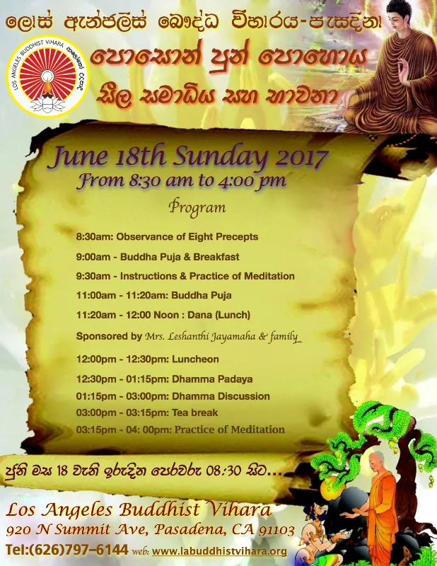 Los Angeles Buddhist Vihara 920 N. Summit Ave., Pasadena, CA, United StatesOrganized by the Los Angeles Buddhist Vihara Fee: FREE Contact: Ven. Dhammapeethi Thero at (626) [...]