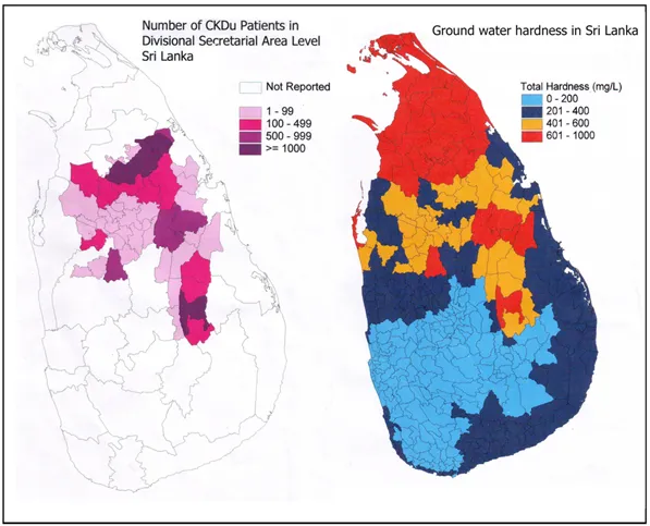 According to the proven scientific researches CKDu is directly related to the geographical distribution of patients with CKDu and ground water hardness in Sri Lanka. According to the Ground water hardness data- with the courtesy of Water Resources Board of Sri Lanka, a highly statistically significant positive correlation (p < 0.008) has already been revealed between the occurrence of CKDu in Sri Lanka and hard water consumption. 96% of the CKDu patients had consumed hard or very hard water for at least five years, from wells that receive their supply from shallow aquifers. Apart from that, the authors have made the following observations related to CKDu and the hardness of the drinking water