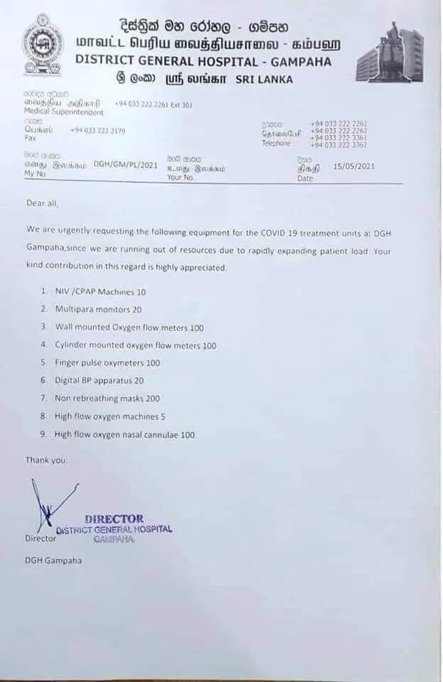 We are requesting the following equipment for COVID-19 treatment units at DGH Gampaha since we are running out of resources due to rapidly expanding patient load. Your kind contribution in this regard is highly appreciated.