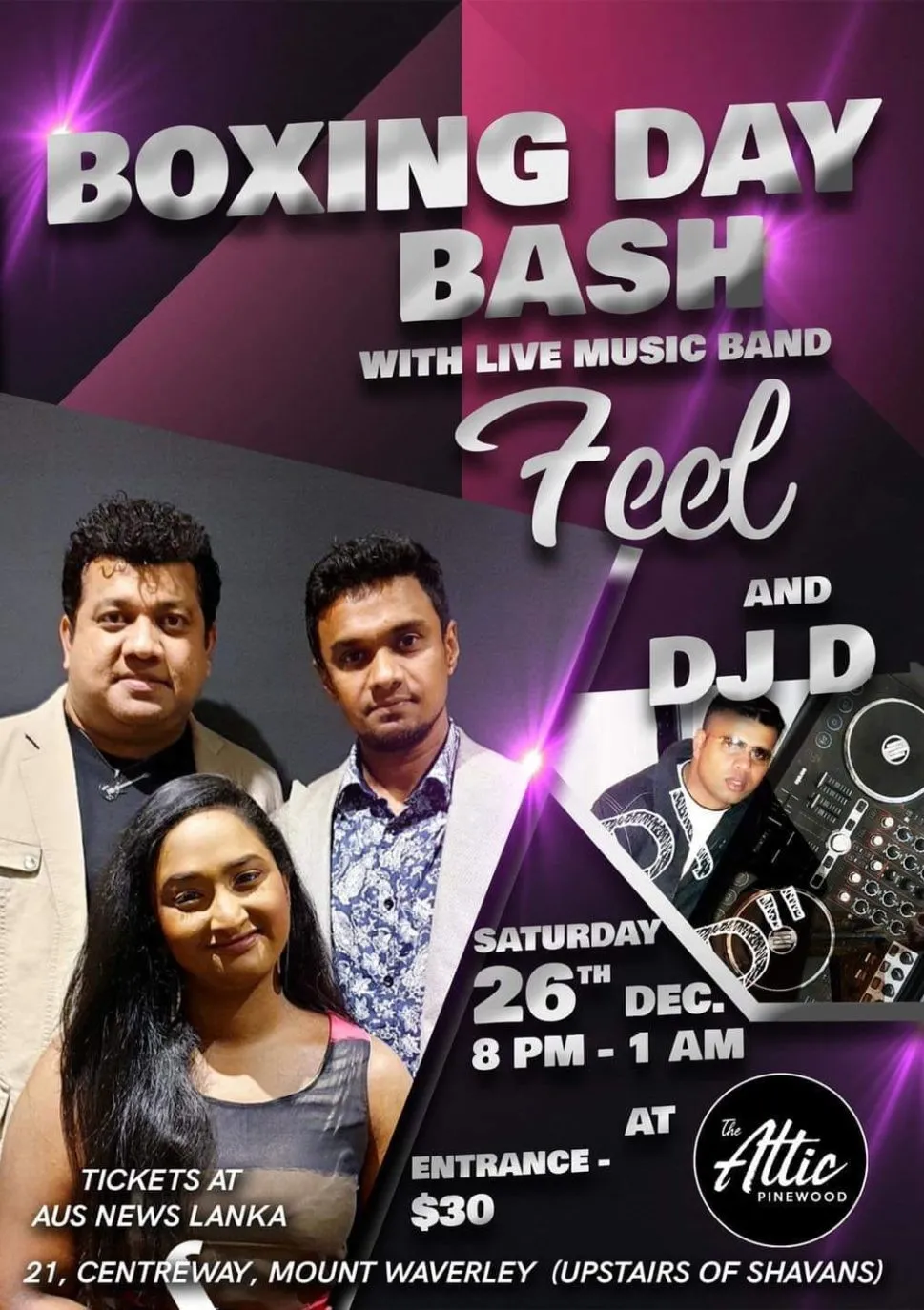 Boxing Day Bash with Live Band Feel and DJ DTicket fee: $30.00 Contact: Pradeep Gamage +61 040 6840289