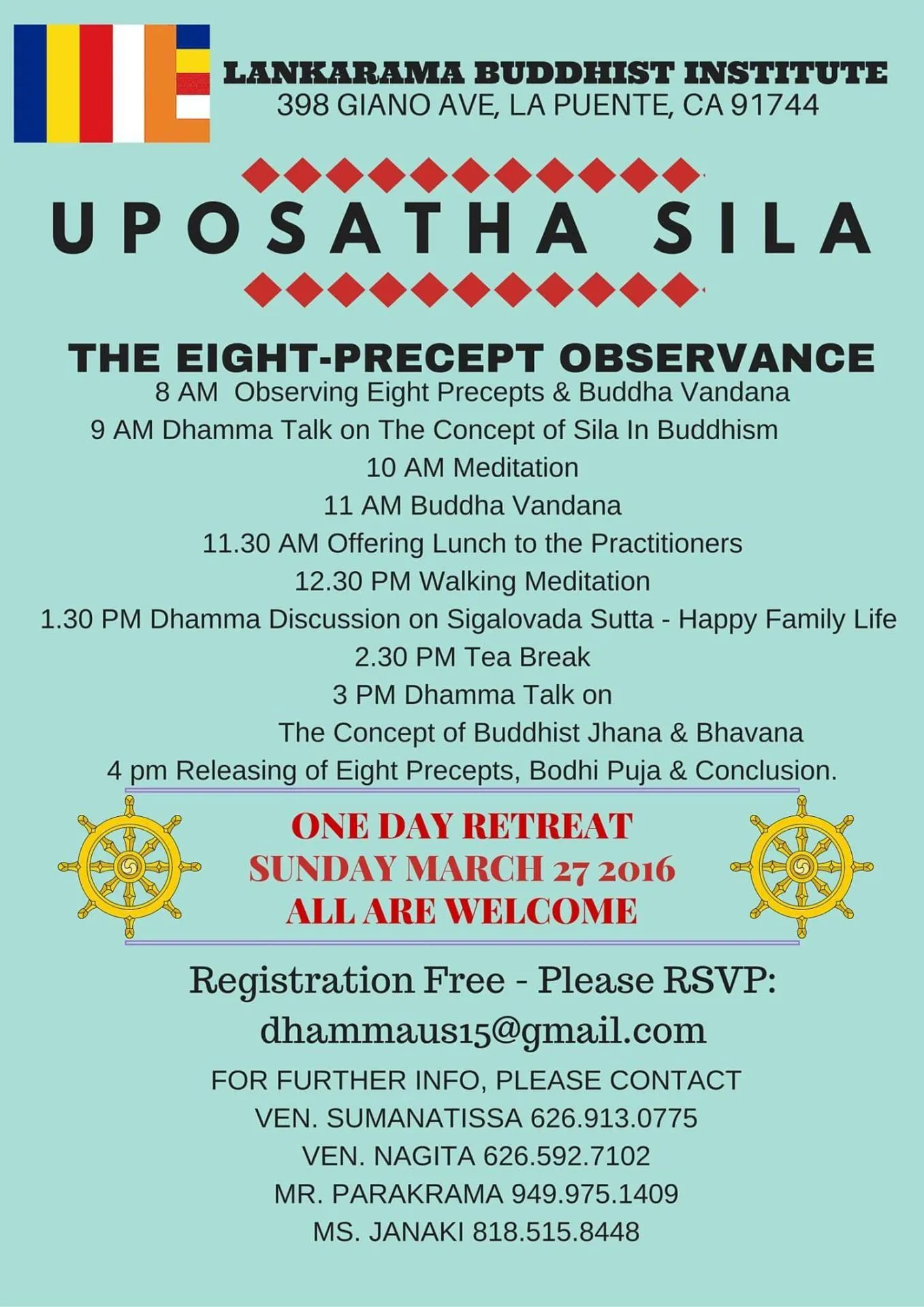 Uposatha Sil: - A One Day retreat to observe Eight-Precepts. For more information: Ven. Sumanatissa [...]