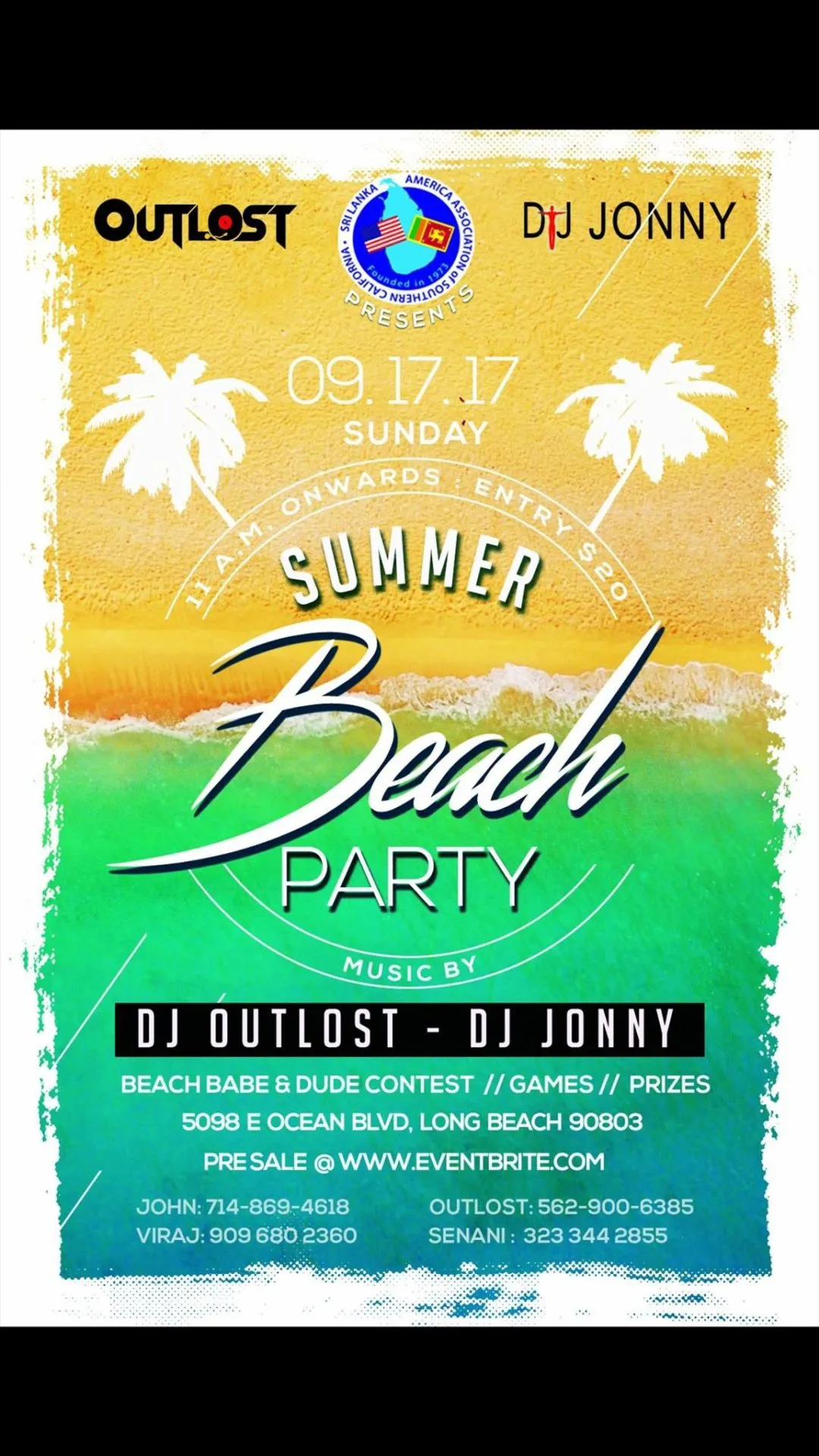 SAVE THE DATE!Beach party presented by SLAASC Contact: Viraj De Silva (909) 680 2360