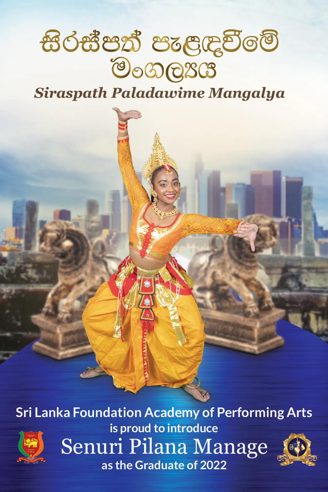 On Saturday, December 10th, 2022, the Sri Lanka Foundation Academy of Performing Arts (SLF APA), founded in 2015 and Accredited in 2019, held its second inaugural graduation ceremony at the Mindfulness Meditation Center in Covina, California. Senuri Pilana Manage, with her indomitable courage, effort, and commitment, became another successful graduate of Kandyan dance in our second Siraspath Palandaweeme Mangalya (Graduation) ceremony. She is a senior student who participates in online and in-person dance classes at the Academy of Performing Arts in Sri Lanka Foundation (SLF APA). She was exploring to gain knowledge and new experiences through her learning process. Sri Lanka has a unique and rich traditional dance history of over 2500 years. Sri Lankan traditional dances offer worship, healing and meditation processes, sickness, and invoking blessings. Sri Lankan Traditional Dance graduation is called a “Kalaeli Mangalya.” When a Kandyan dance student has been dancing for several years and has